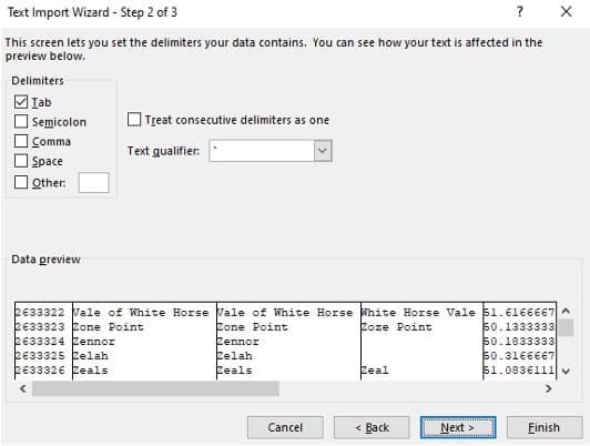 • Click Next to proceed to Step 2, where you need to select your ‘Delimiters’: make sure Comma is selected. You can then click Finish (leaving the defaults selected for Step 3).